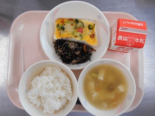今日は、春休みに調理員さんたちと調理実習をしたカラフルオムレツ給食です。