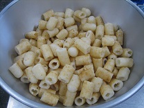 きりたんぽは、炊いたお米をつぶして、串に巻いて焼いた物です。これを鶏ベースのスープで煮た鶏肉、ごぼう、まいたけ、とうふ、糸こんにゃく、小松菜、にんじんの中に入れました。スチームコンベクションで一度焼いてから入れたので、煮くずれせず仕上がりました絵文字:良くできました OK