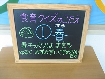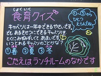 ブラックボードを2枚使って、食育クイズコーナーを作りました。ランチルーム入口に問題を、ランチルームの中に答えを書いたボードを置いてみました。食育の知識を少しでも増やしていってほしいなと思います絵文字:良くできました OK