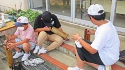 A君「おじさんたちにさそわれて竹と竹をしばりました。ほとんど教えてもらいました。ふつうの結び方とちがいました。おじさんたちは,すごくガッチリとした体でした。たくさん米を作っているからだと思います。もう米がなってました。すごく田が広かったです。いねかりが9月にあるので,どんなことになるのか,すごく楽しみです。」