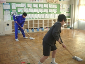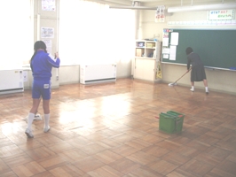 1年生から6年生まで水拭き掃除をした後、5・6年生と先生方でワックスがけをしました。