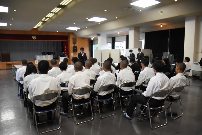 令和7年10月20日(月)、本校1年生25名、門前中学校3年生13名、七尾特別支援学校輪島分校6名を対象とした、中高特支合同選挙出前講座がおこなわれました。この行事は、連携型中高一貫教育の行事として毎年実施されています。会場となった門前会館3階ホールには、実際に使用される記載台や計数機が設置され、投票所の雰囲気を感じながら選挙を経験できる良い機会となりました。