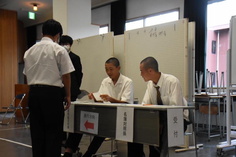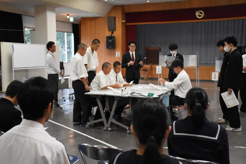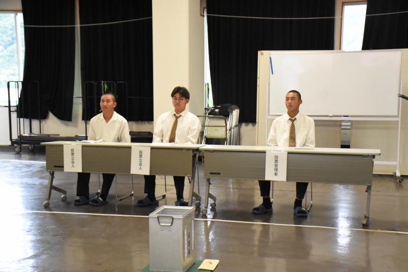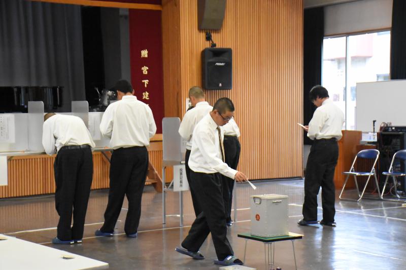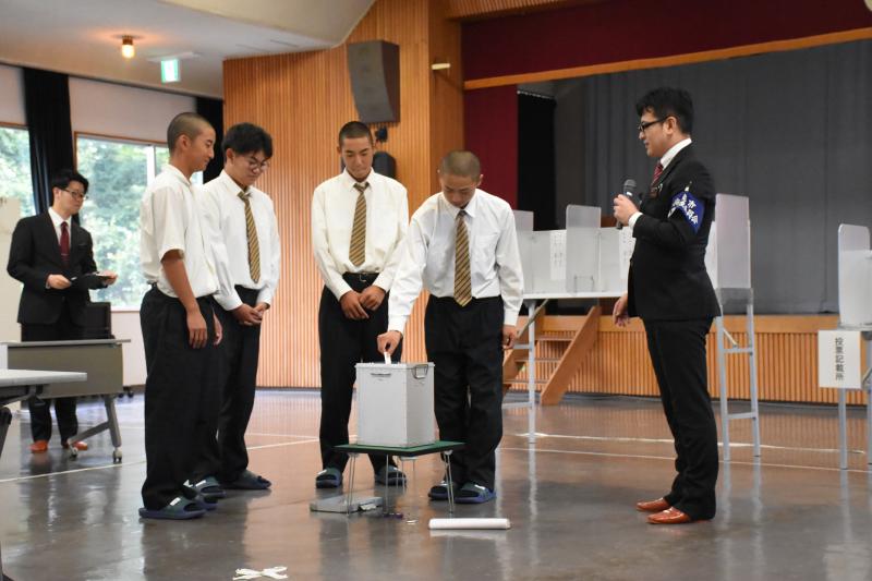ないました。模擬選挙公報をよく読んだうえで、思い思いの候補者を選び、投票箱に向かう生徒たちのすがたが見られました。また、一部生徒は投票事務従事者として、投票管理者や受付等の役割も体験できました。その様子をうかがいながら、将来、公務員として選挙を運営する人や、立候補者として選挙活動をする人が出ることに期待が高まりました。