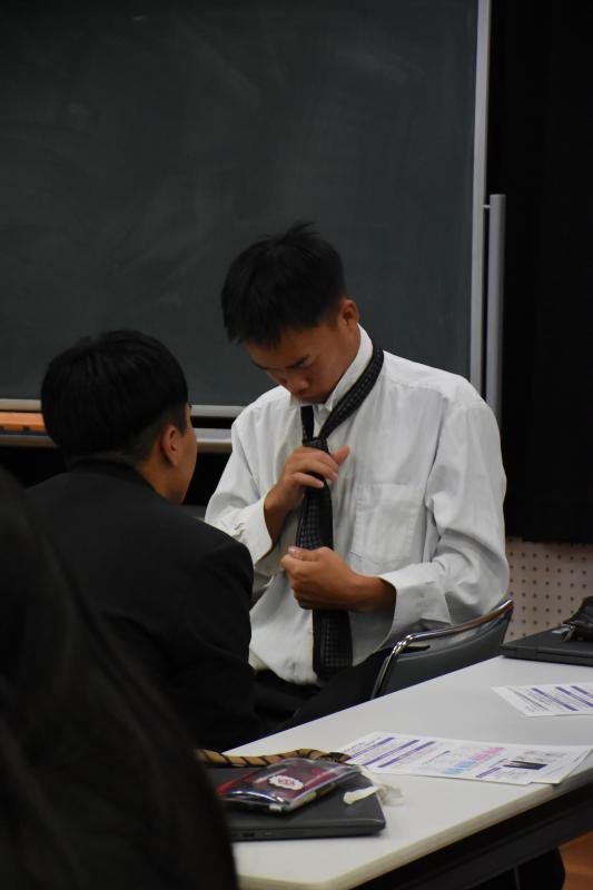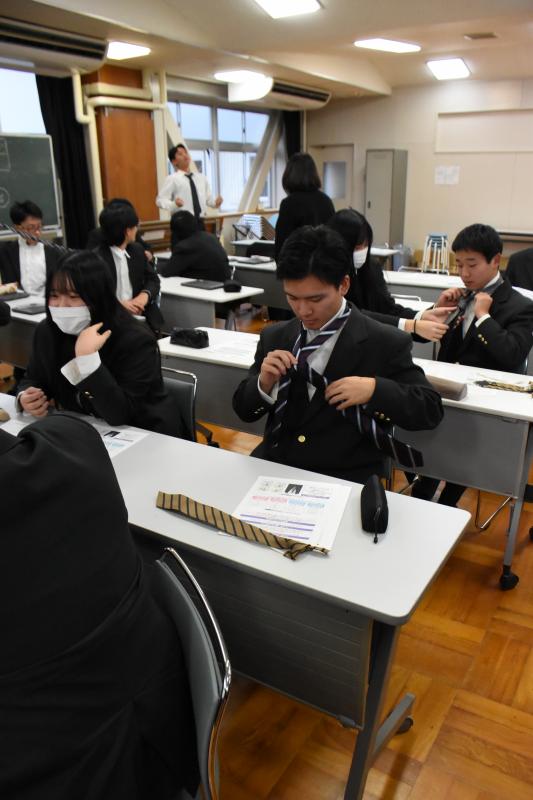 最後は毎年恒例の、ネクタイを締める体験をしました。やり方を知らない生徒が大半でしたが、楽しそうに試行錯誤する姿が印象的でした。制服のネクタイとは違う、シックなものを身にまとったからか、妙に貫禄が出た生徒もいました。ネクタイの力、恐るべしといったところでしょうか。