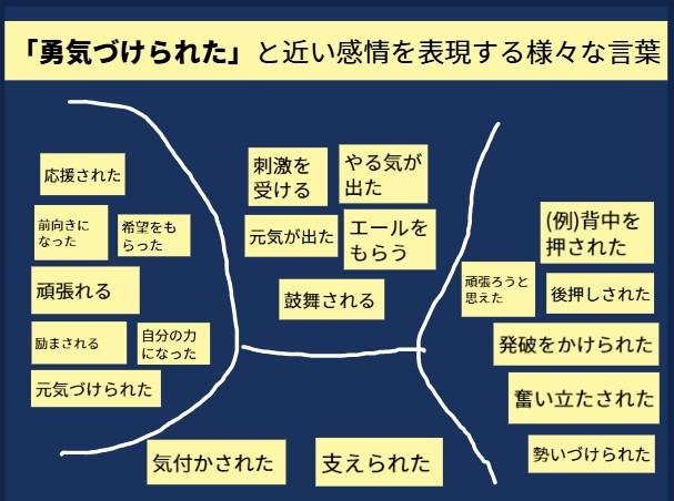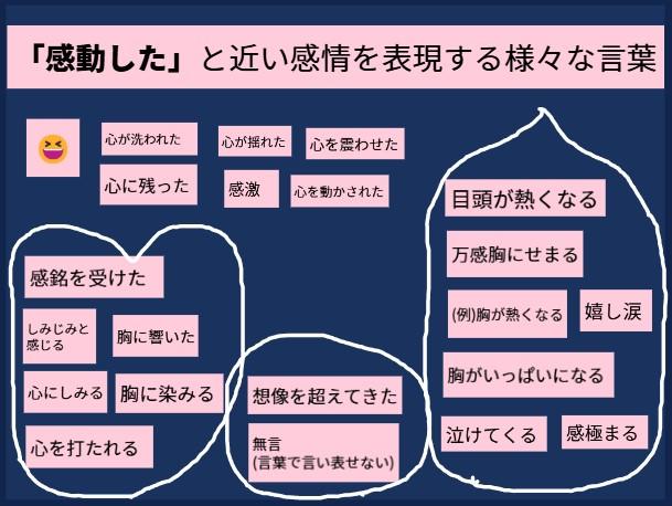 読書週間前、表現や言い換えについて学ぶ国語の授業のなかで少し時間をとり、各クラスで「表現リスト」を作成しました。感想でよく使う言葉をピックアップし、その言葉の関連語や言い換え語を思いつくだけあげるという活動を行いました。できあがったものを一部ご紹介します。