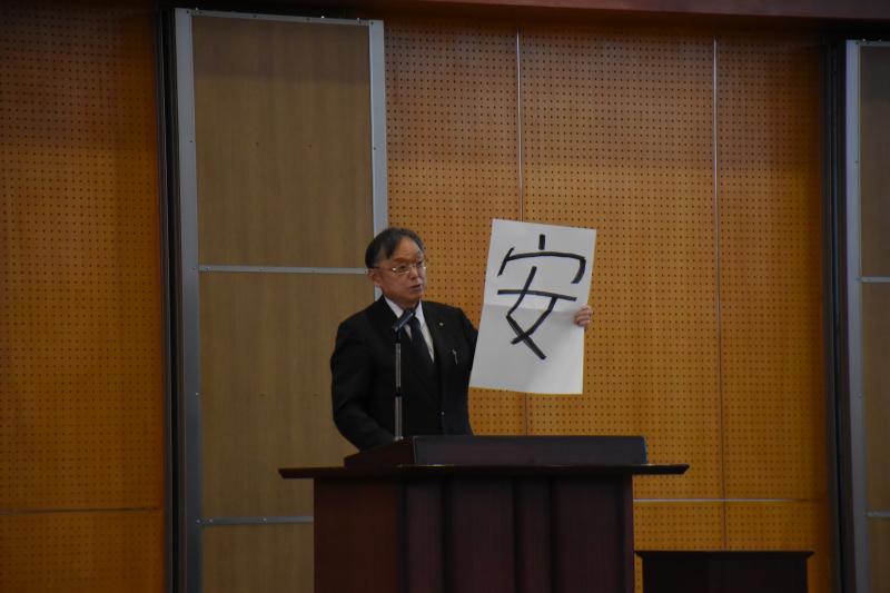 校長先生が選んだ2024年を表す漢字は「安」。理由として、能登半島地震を乗り越えた一年の中での「不安」と、次年度への「安心」への願いを挙げられました。また、生徒たちにも「門前高校の2024年を表す漢字」を考える宿題が出され、3学期始業式で発表される予定です。