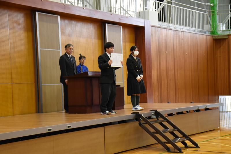 中澤 賢 校長先生は式辞で、2024年を振り返りながら、未来への希望を語りました。今年の世相を表す漢字「金」を引き合いに、部活動や学業、学校行事を通じて生徒たちが「自分を研ぎ続けた」成果を讃えました。