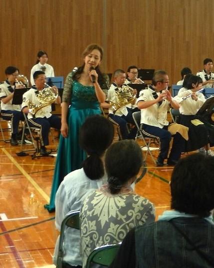 さて、その演奏会には200人ほどのお客さんが駆けつけました。第1部が合同演奏、警察からの防犯等の連絡を挟んで、第2部が県警音楽隊単独でのドリル演奏で構成。 第1部では、吹奏楽曲ばかりでなく、本校卒業生で元劇団四季のソプラノ歌手、廣野美由紀さんもゲスト参加。震災復興を願って、竹内まりやさんの「いのちの歌」と東日本大震災復興ソングの「花は咲く」を合同バンドの伴奏で歌われました。第2部は、体育館の半分を十分に使った県警音楽隊のドリル演奏(ドリル演奏とは、楽器ごとにいろいろなパターンで動きながら演奏することです)。
