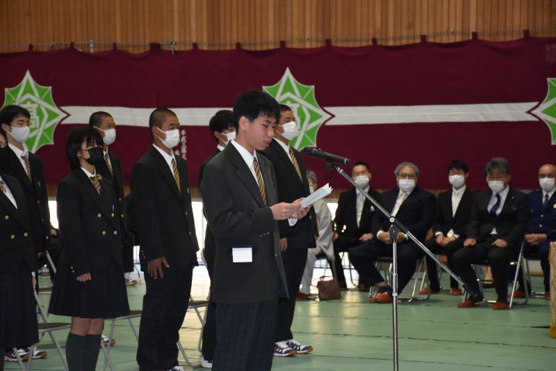 歓迎の言葉では、2・3年生代表の中村 光志 さんが「活気が増し、時にはうまくいかないことがあるかもしれないが、互いに助け合い、門前高校の新たな伝統を築いてほしい」と述べました。また、新入生宣誓では新入生代表の野中 涼平 さんが「今日から始まる高校生活において、楽しいこと、苦しいこと、辛いことなどもあるかもしれないが、仲間とともに乗り越えていきたい」と力強く述べました。