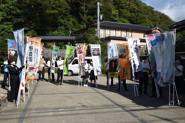 門前高校1年生が門前町にあるお店を宣伝する幟旗を作成しました。