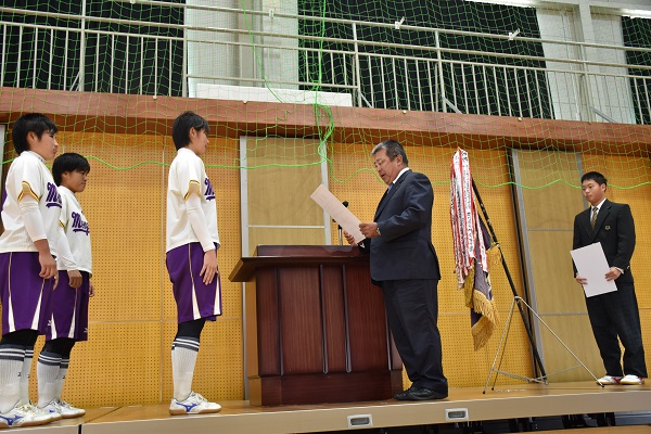 大窪校長から優勝旗と表彰が選手たちに手渡されました。大きな大きな優勝を門前高校に運んで来てくれた選手達に心からお祝い申し上げます。