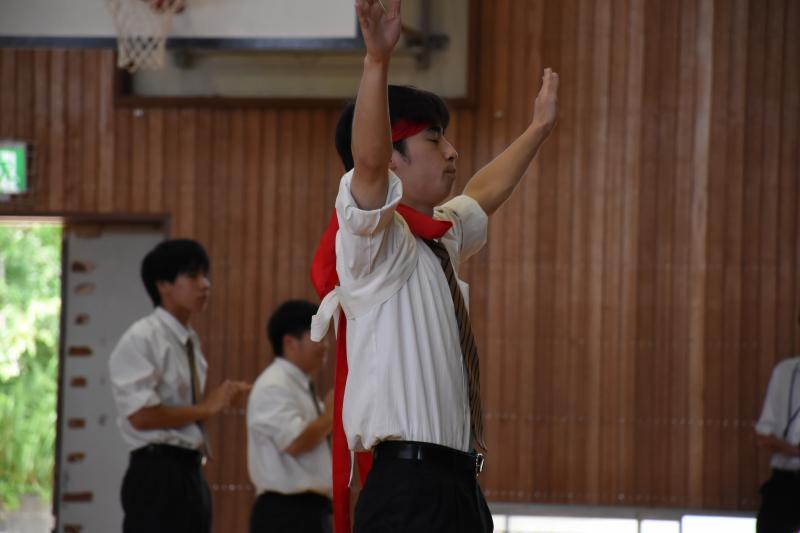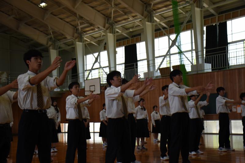 応援団による全校応援では、野球部員が大半を占める応援団に代わり、急遽結成した臨時応援団にも拘わらず、熱い応援を行ってくれました。特に、部活動を引退した3年生が総体の壮行式の応援に応えるように、迫力あるかけ声と身振りで選手を激励してくれました。