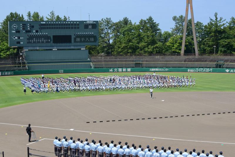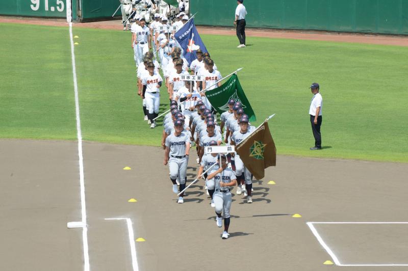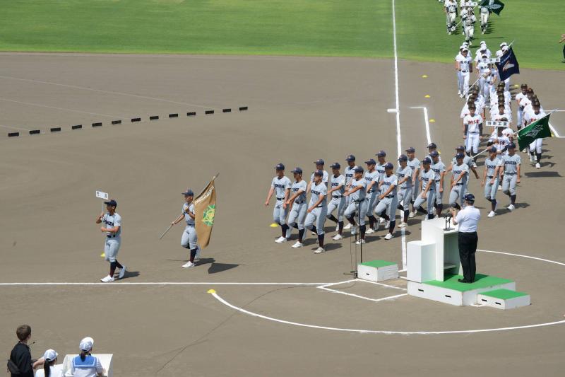 「選手、入場」。快活なアナウンスに従い、真剣な面持ちをした選手の入場行進が始まります。整然とした隊列からは、凛とした態度が伝わってきました。各校の伝統ある校旗がはためく中、熱い夏の始まりをひしと感じます。