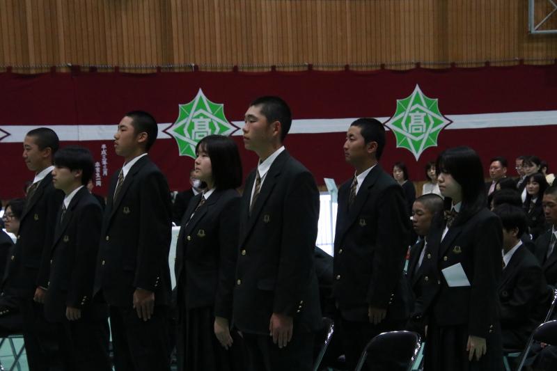 「精勤賞、皆勤賞を表彰された皆さん、おめでとうございます。心よりお祝い申し上げます。1年間をとおして頑張って通学するということは大変なことです。昨年は大震災もありました。地域の、この門前町の皆さんと共に、いろんな面で勉強しながら、地域の事を思いながら、頑張っていただいたなと、一町民として感謝に堪えない次第です。校長先生からは「今年は生徒の自主性に任せたい。修学旅行先のひめゆりの塔で自費による献花をした生徒さんもいた。」ということを聞き、人として、大変すばらしいことだなと感じた。新しい年度を迎えるにあたり、高校生活を楽しみ、全員が、精勤、皆勤賞を取れるように頑張っていただきたい。」と力強く励ましていただきました。ありがとうございました。