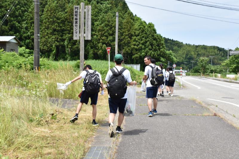 令和5年6月14日(水)、清掃遠足を実施しました。清掃遠足とは、門前高校から3km程のところにある道下サンセットパークまで歩く「遠足」と、道下サンセットパーク裏の海岸のゴミ拾いを行う「清掃」を兼ねた学校行事です。団体行動や清掃活動を行うことで、他者と協力する大切さや思いやりの精神を養うことをねらいとしています。
