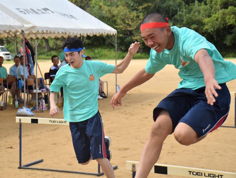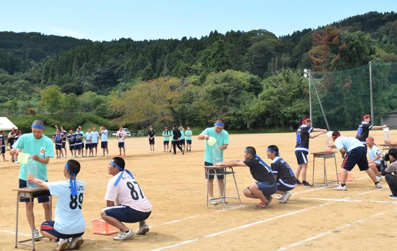 団対抗リレーでは先生もチームを組み、アンカーの校長先生が大激走!