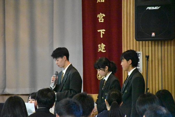 この会には、門前中学校の全生徒、本校の全生徒、ご来賓、保護者、関係者の方が