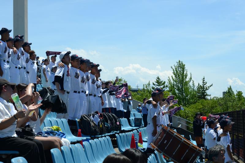 1・2回は、互いにチャンスをものにできず進みます。3回表、1アウト1・3塁の場面で打者は2番 大豊。打球はショートゴロでしたが、先制点を獲得します。次の回にも門前高校が点を重ね、迎えた4回裏は、泉丘高校も粘り強い攻撃をみせて1点を返されました。譲れない戦いであることをひしと感じるばかりでした。途中、先発ピッチャーの11番 石田に代わって3年エース1番 塩士が登板しました。ベンチでは、俺が後ろにおるから大丈夫や、という頼もしい声掛けが聞こえてきていました。堅い守備で追加点をおさえつつ、6回表には6点獲得するも、裏に3点取り返されるという波乱の展開を迎えます。ですが、苦しい状況でも明るい表情や前向きなコミュニケーションはとだえませんでした。その後、点数に動きは見られず、8-4で門前高校が勝利しました。