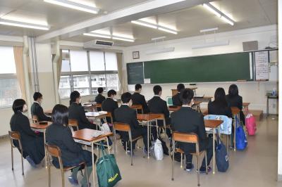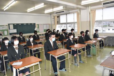 始業式では金岡校長が2学期終業式で話したことを振り返り、「今自分があり、一生懸命に頑張れる環境があるのは家族のおかげであること」に触れ、感謝の気持ちを大切にするように冒頭で話をしました。また、3学期は「自立」の学期であることに触れ、努力を継続することの意義を生徒に呼びかけました。さらに、頑張る時と休む時をしっかり区別することがポイントであるとアドバイスしました。
