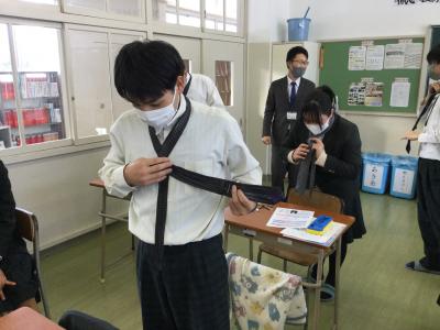 令和4年1月21日(金)、洋服の青山(七尾店)の加納様より、お店で実際に取り扱っているスーツを使って、着付けなどを教えていただく会を行っていただきました。4月からスーツを着る機会が増える生徒もいます。大変貴重な体験をさせていただき、本当にありがとうございました。
