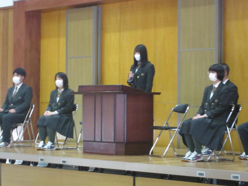 退任式では、後期生徒会会長の登 柊士郎さんが退任の挨拶として、「前期生徒会役員となる皆さんには、さまざまな意見を聞いて生徒会行事を丁寧に進めてほしいものです。期待しています。頑張ってください」と前期生徒会役員を激励しました。