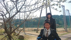 2年2組社会福祉系の授業「介護福祉基礎」では、校内やその周辺を車いすで散策しました。2年生は初めて車いすに乗りました。普段何気なく通っている学校からバス停までの道のりが坂になっていたり、段差があったりすることに初めて気づくなど、驚きの連続だったようです。