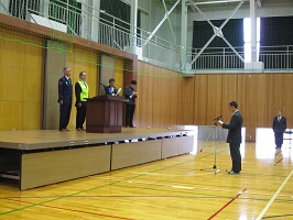本日は交通安全推進隊結成式が行われました。門前中学校の生徒会執行部、門前高校生徒会執行部、クラス代表からなる交通安全推進隊を代表し、門前高校生徒会長の田川智丈くんは「交通事故により、多くの尊い人命が失われている現状を正しく認識し、交通事故をなくすため、ここに門前中学生、門前高校生から成る交通安全推進隊を結成します。一人一人の社会的責任を十分に自覚し、正しい交通ルールとマナーを守り、積極的に交通事故防止に貢献することをここに誓います」と力強く宣誓を行いました。