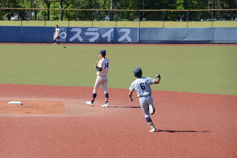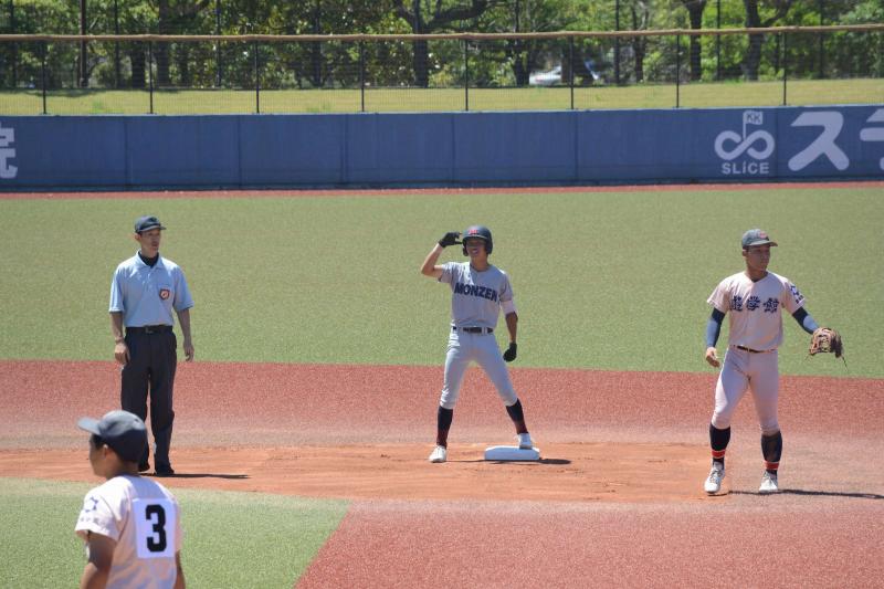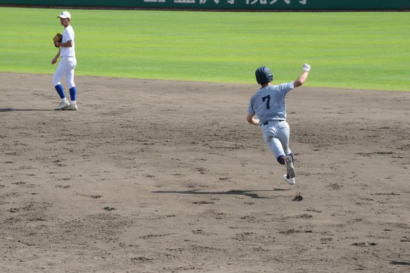 このホームランは遊学館高校にも緊張感を与えることになりました。門前高校が2点を先制する3回裏、相手の猛攻にあって逆転を許してしまいます。4回裏にはさらに3点追加され、3対7と4点を追う厳しい状況になりました。流れを持っていかれたかと思われましたが、門前高校の選手たちの目はギラギラと輝いていました。5回表、1アウト2塁の場面で、背番号3番 石崎雅治がヒットを放ち、1点を返します。さらに、クーリングタイム明けの6回表、1アウト2塁の場面で、背番号6番 山本健文がツーベースヒットを打って1点を追加すると、続いて打席に立った背番号4番 丸井颯人のスリーベースヒットで6-7となります。あと一歩という状況で、頼れる主将、背番号5番 大豊瑠侍の打った2球目はショートゴロとなりますが、3塁ランナーが帰ってきて見事同点に追いつきました。しかし、7回以降に門前高校の点が動くことはありませんでした。