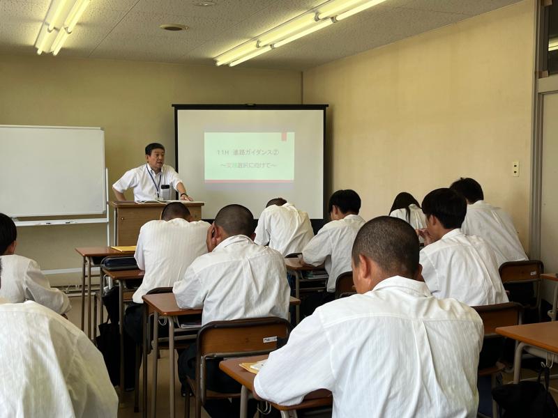 7月18日の3限目は1年生の各クラスで進路ガイダンスを行いました。2年次より、1組の皆さんは文系・理系に、2組の皆さんは商業コース・福祉コースに分かれてそれぞれ授業を受けることになります。