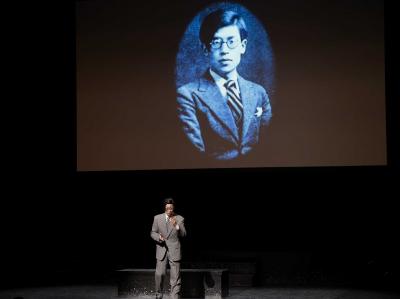 野村萬斎さん(下)が中島敦氏(下)になりきって生徒達に語りかけ