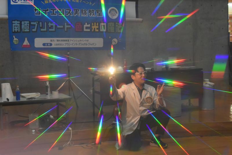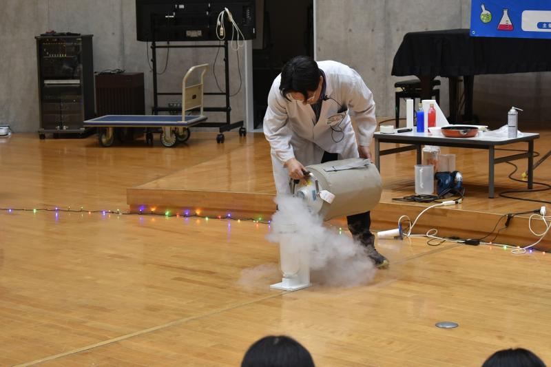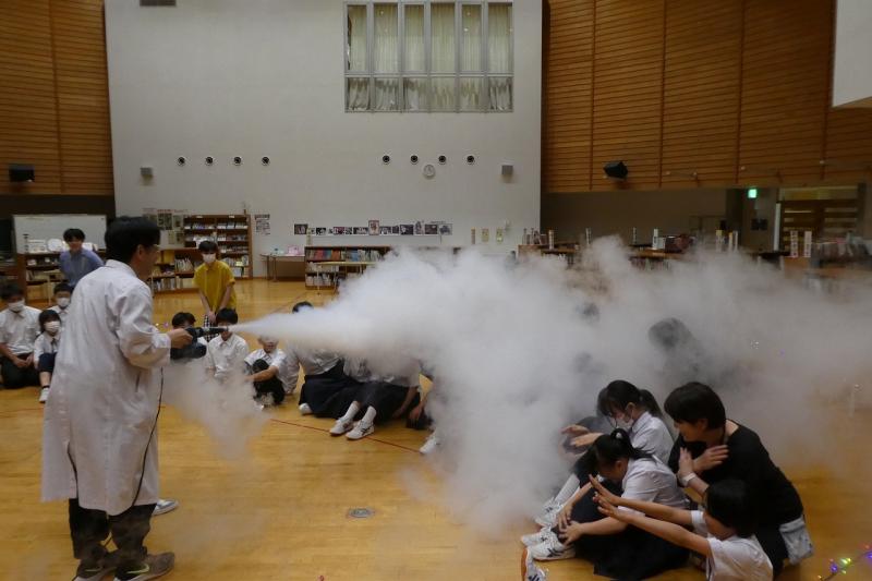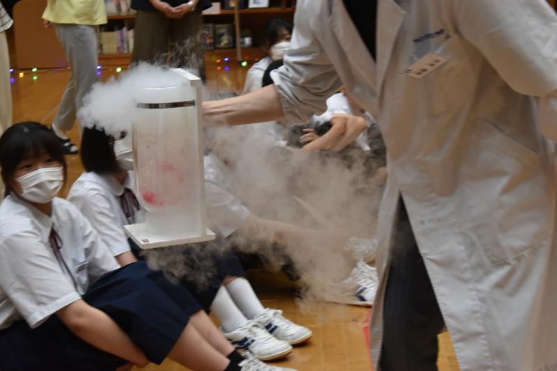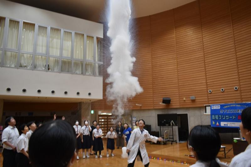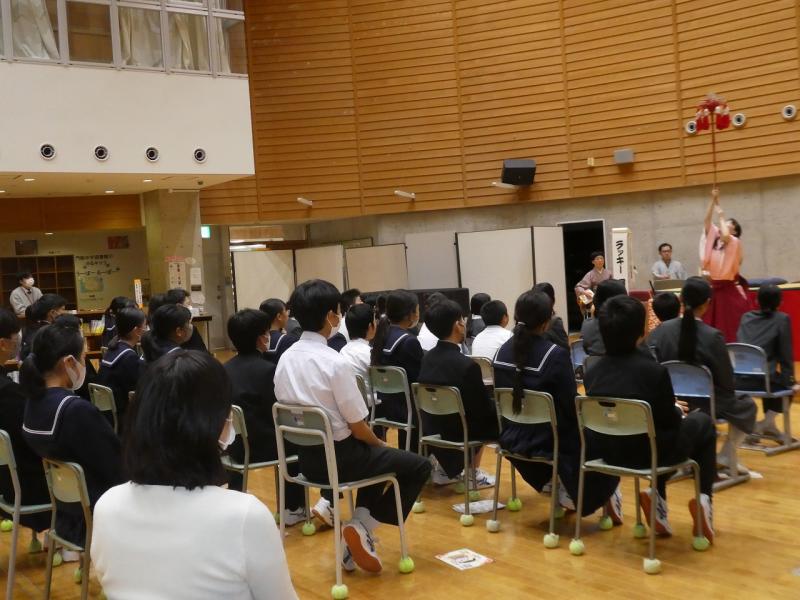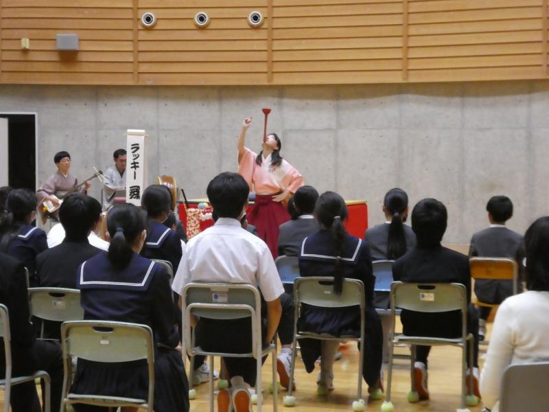 続くラッキー舞さんの太神楽曲芸では、包丁を使ったスリル満点の技に会場中が息を呑みました。体験コーナーでは代表の生徒や先生も傘回しなどに挑戦し、プロの技の難しさと楽しさを肌で感じるひとときとなりました。