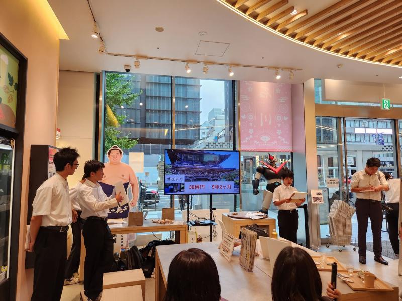 テラスを来店されたお客様の前で、總持寺の現状と復興について発表し、あわせて新聞とミニキャンドルを配布して、總持寺のPRに努めました。テラスでは、これまで本校(門前中)を支援してくださった方々も来店され、嬉しい再会を果たすことができました。また、お客様の中には、門前町や總持寺に強い関心を持たれた方もおり、「ぜひ訪れたい」と温かい言葉をかけてくださる方もいました。