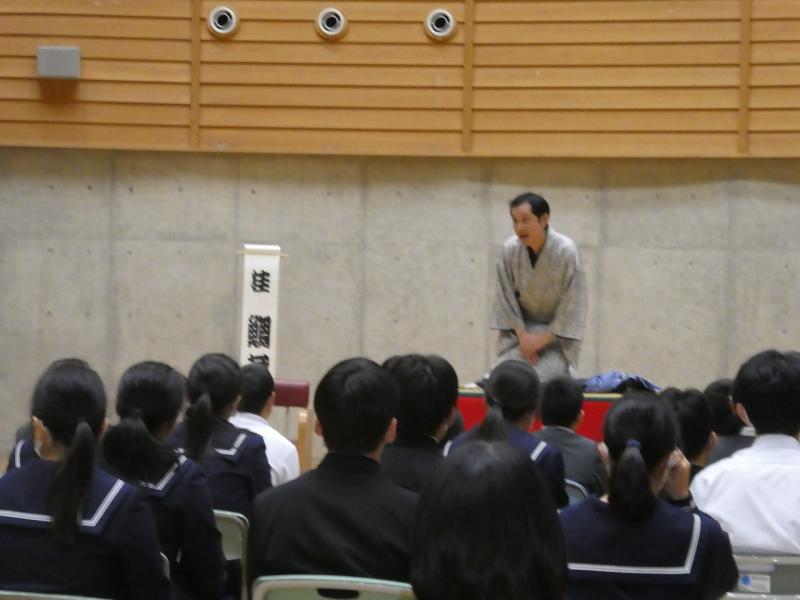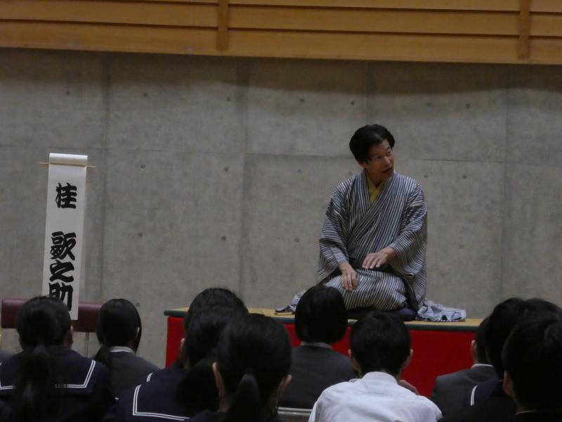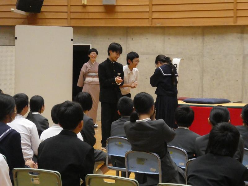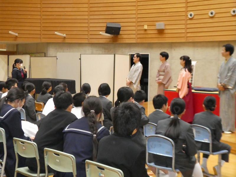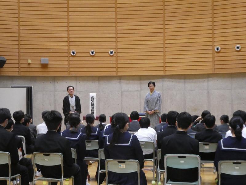前半の落語では、扇子と手ぬぐいだけで虎の鳴き声を表現したり、うどんをすする音を出したりするプロの話芸に、生徒たちは「想像力が刺激された」と大興奮。『動物園』や『時うどん』といった演目で、会場は大きな笑いに包まれました。