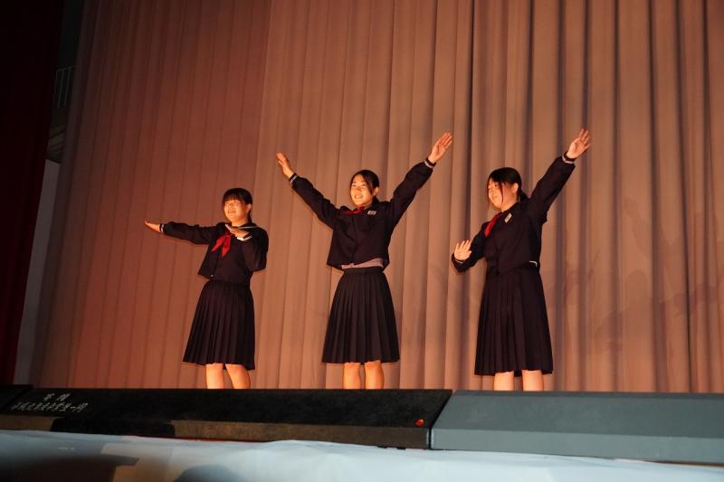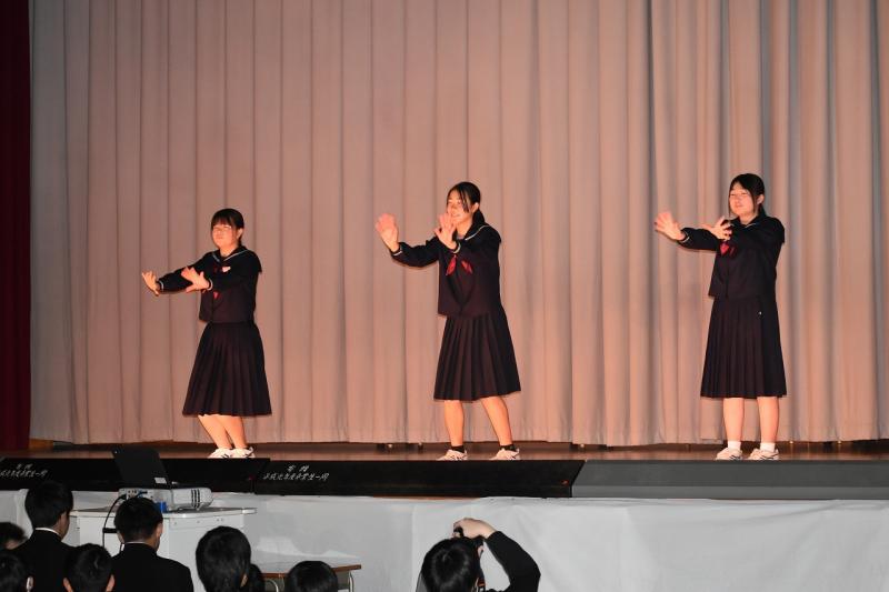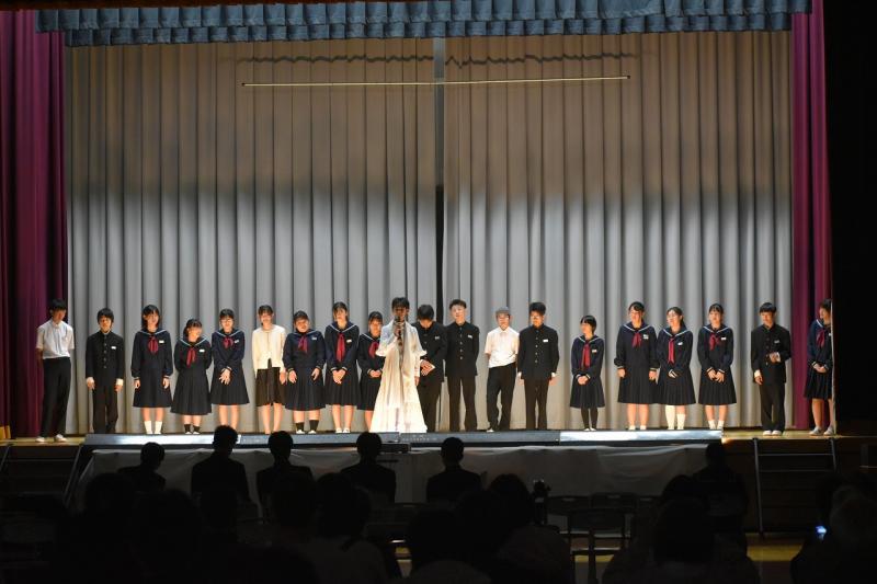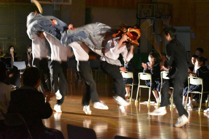 学年発表においては、1・2年生が「僕らの日常」をテーマに劇やドレミパイプ演奏を披露しました。自分たちで考えたユニークな脚本や、怪異役などの個性的なキャラクターが会場の笑いを誘い、温かい雰囲気に包まれました 。3年生は「デントウヲカイホウ」と題して地元の獅子舞を勇壮に舞いました。初めて挑戦する生徒も懸命に練習を重ね、その姿は「地域の方にも褒めていただけた」と誇らしげでした 。獅子舞の後は3年生が作成した動画で会場はまた盛り上がりました。