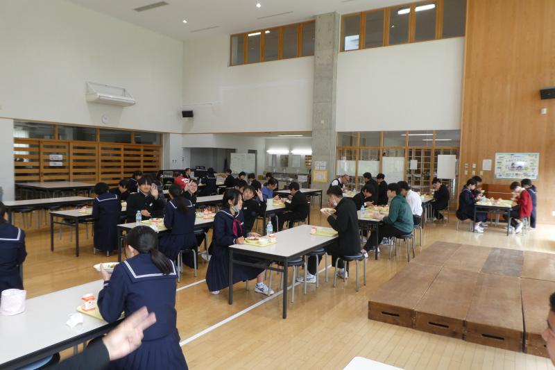 今日は中学校での最後の給食。調理員さんへ感謝の気持ちを伝えました。