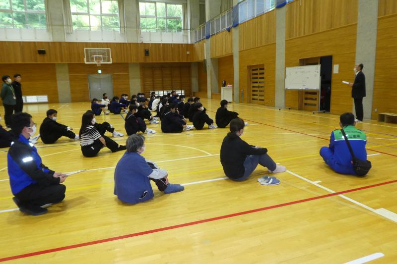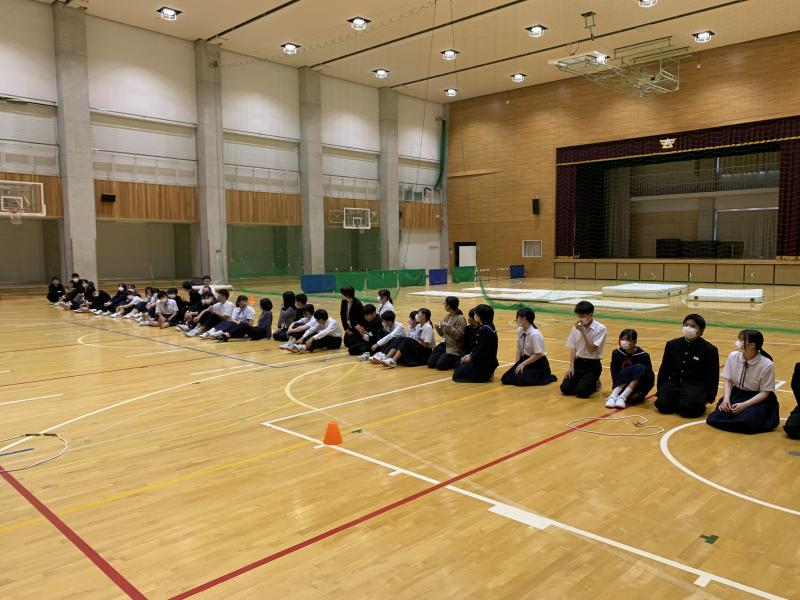 5月16日の4限目に中学生と避難所の人で避難訓練を行いました。雨天のため体育館に集合しました。その後は、消火器の使い方について説明を受けました。今回の地震を教訓として生活していってほしいです。最後は、教室へ戻って振り返りをしました。