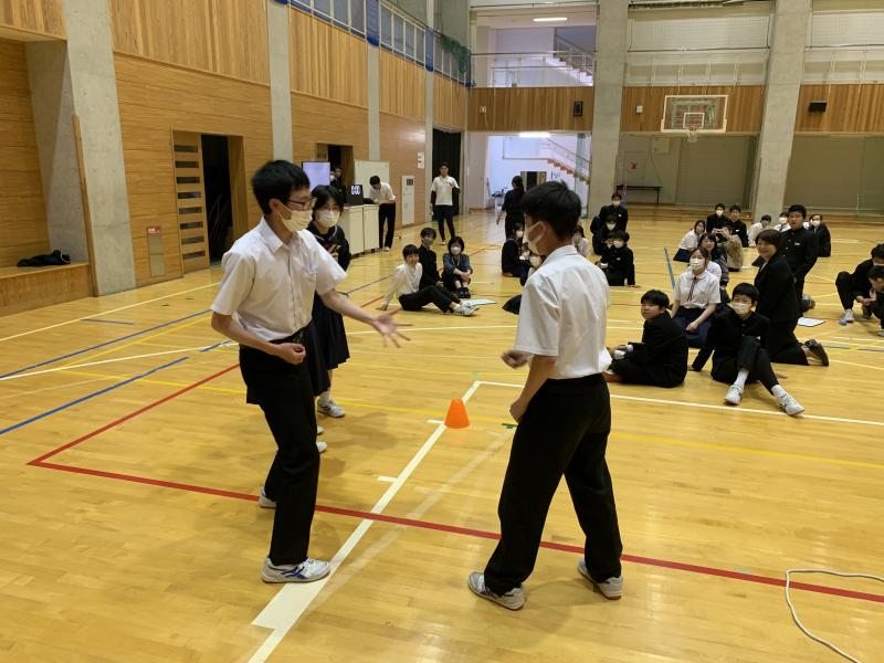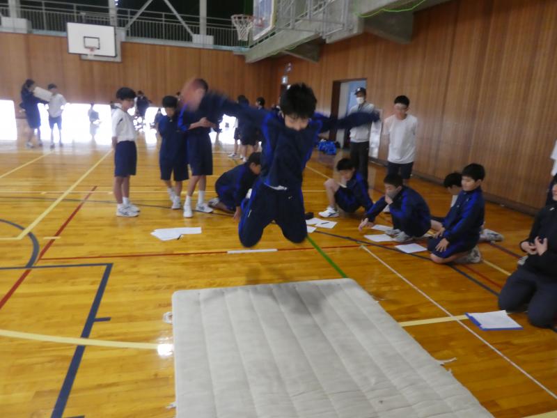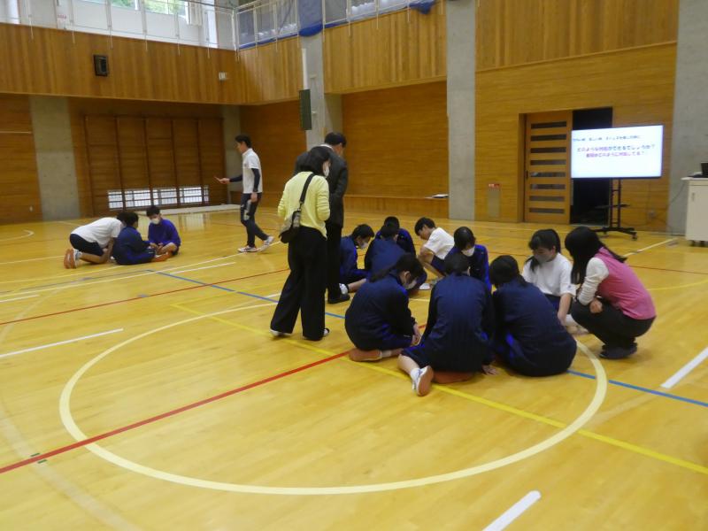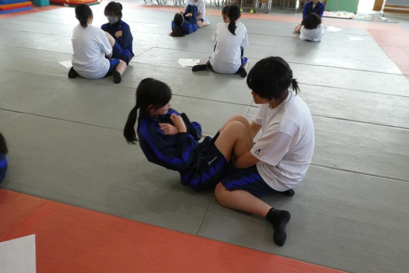 1年生の保健体育では、生徒たちが側転から前転や後転がスムーズにいくための意見を出し合いました。