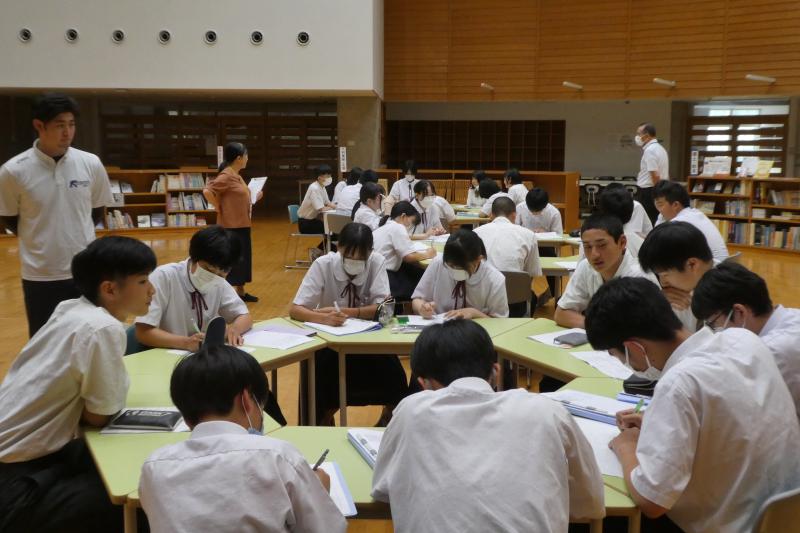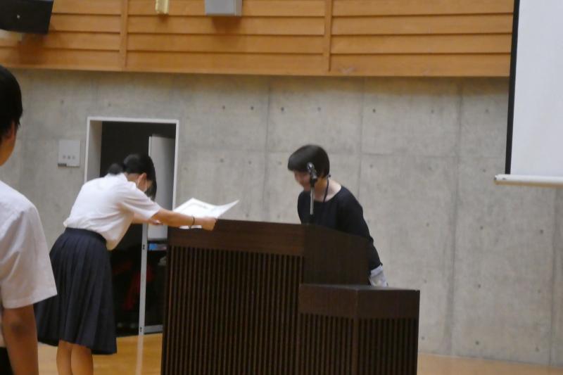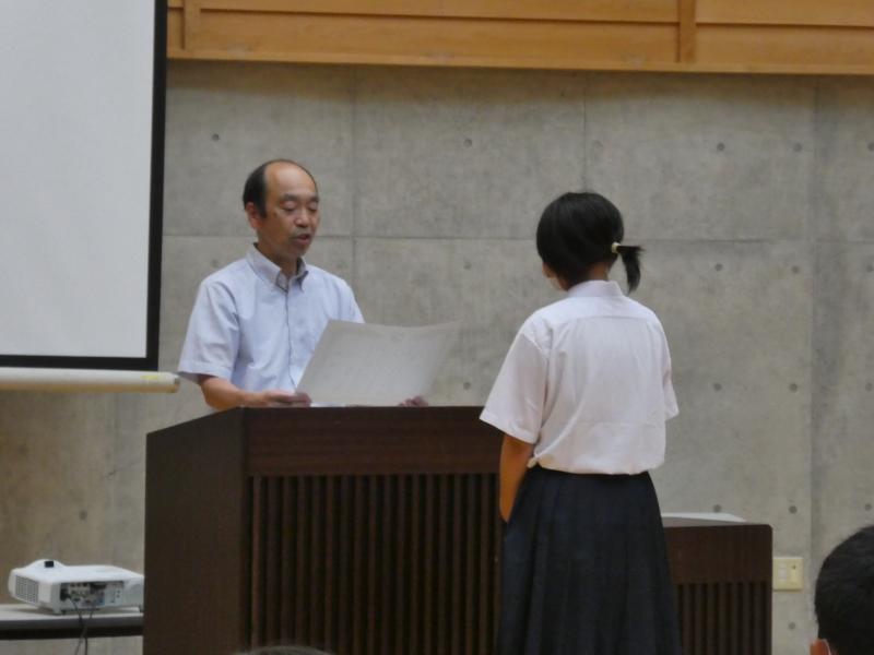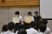 7月19日(金)の午後から表彰式と終業式がメディアセンターで行われました。最初に期末テストの成績優秀者が表彰されました。2学期も頑さらに多くの生徒が表彰されるように期待しています。次に学校長から1学期始業式で伝えた「志」について、振り返りのお話がありました。充実した夏休みにするために、「志」をもって過ごしてほしいものです。最後は生徒指導から夏休み中の生活について話がありました。特に今年度は、地震による影響で海岸の地形が変わっていること、今まで泳ぐことができた海岸も遊泳禁止となっていることなどを伝え、注意を促しました。40日以上にわたる夏休みですが、安全と健康に留意して事故に遭わないよう生活して下さい。8月30日の始業式には元気な姿で会いましょう。