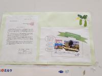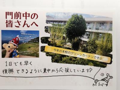 東中学校の校長先生からは豪雨災害のお見舞いのお手紙と共に、熊谷東中学校名物グリーンカーテンの様子と環境委員の先生と「べにくまくん(総合文化部作製)」が9月に訪問した千枚田の様子がレイアウトされているポストカードが送られてきました。