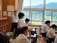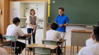 6月7日(金)の総合的な学習の時間に總持寺通り商店街から下口十吾さん、門前交流館から宮下杏里さんを迎え、PR活動について、生徒たちに託したい思いなどを話していただきました。