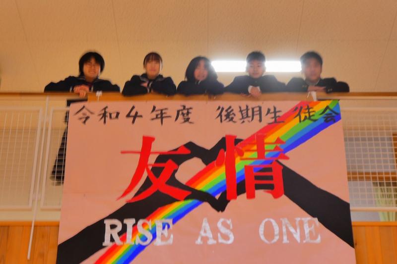 生徒総会で承認された後期生徒会のスローガンを玄関の上に掲示しました。
