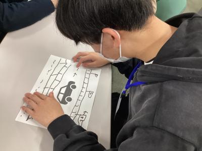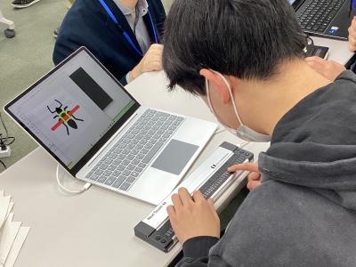 ワークショップ1では触図を自分で作ったり、アニメーションの動きが表示されたブレイルメモに触ったりしてイメージをつかむ体験しました。