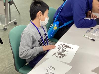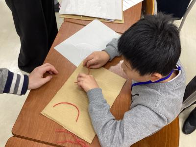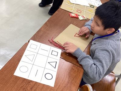ワークショップ2では、Wikki Stixを使ってゲーム感覚で触図をつくる体験をしました。やや粘着する棒状のロウを使って、丸や四角を作りました。そのあとで鳥の図を作ることにチャレンジしました。