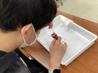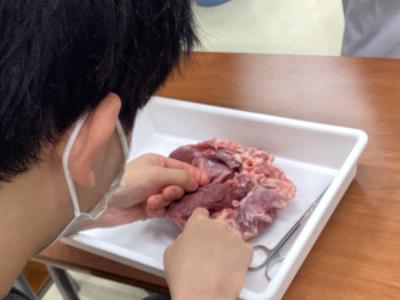 ワークショップ3では、鶏や豚の心臓の触察を通してその複雑なつくりを学びました。心臓の厚さが左右で異なることを触って確かめたり、弁や膜に指を入れてその構造を確かめたりしました。