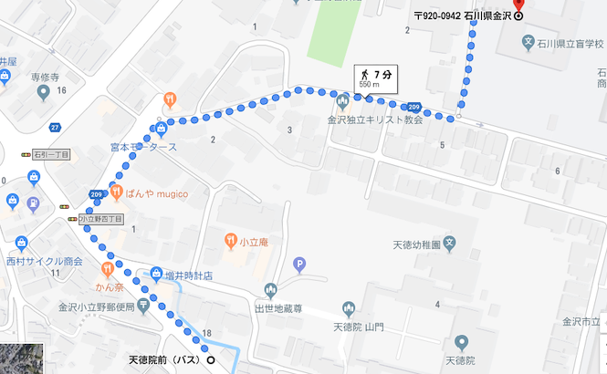 2. 天徳院前バス停から、点字ブロックに沿って少し戻ると、小立野4丁目交差点です。