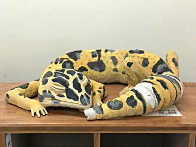 私はレオパードゲッコーというトカゲを飼っている。そのトカゲは生まれた時からペットショップで、本来トカゲが住む場所、住む世界を知らない。狭いケージの中で人間(私)に世話をされなければ死んでしまう儚い生き物だ。それでも彼らは生きている。懸命に生きるトカゲの生きるために寝ている姿を作った。