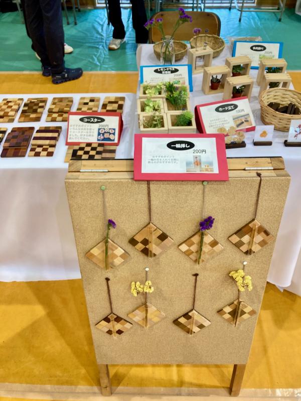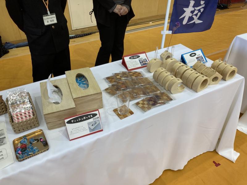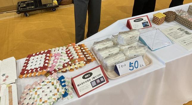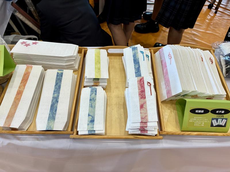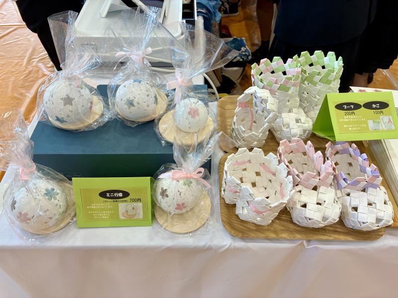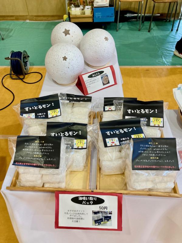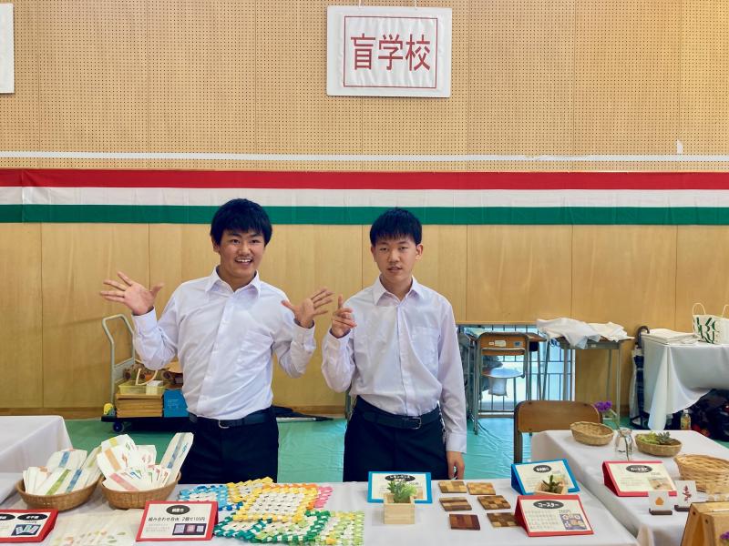 中学部、高等部の作業学習で製作した商品、寄宿舎生のクラフト製品石川県視覚障害者協会「六つ星製作所」の点字用紙リサイクル製品を販売しました。