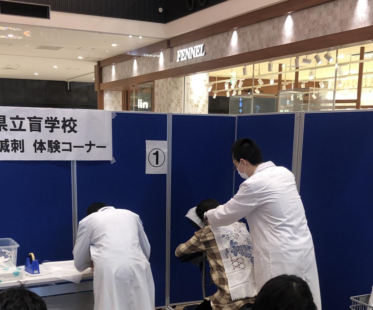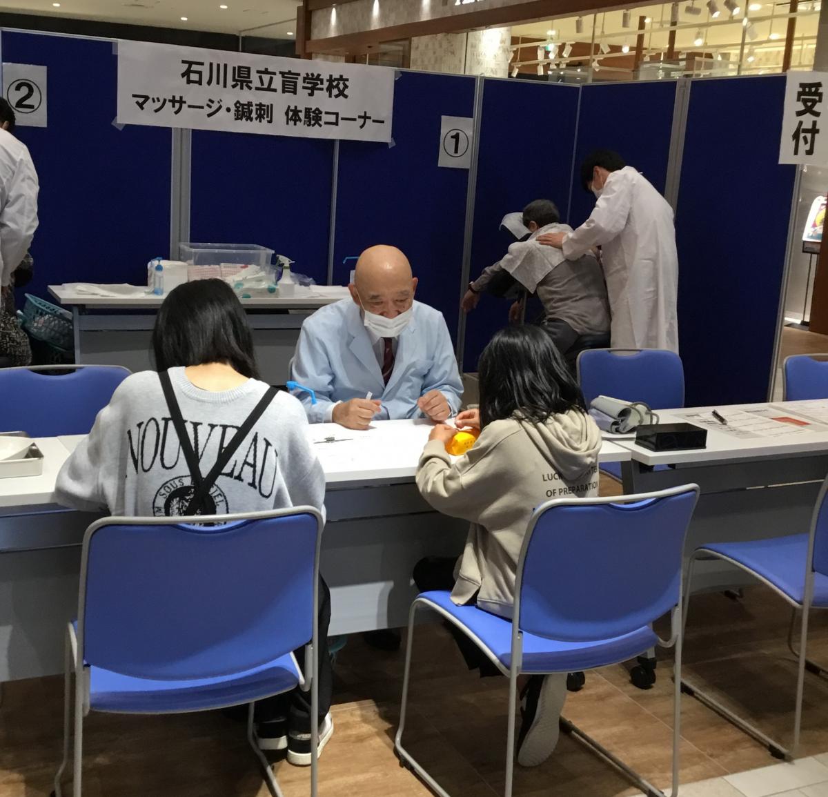 このイベントは、石川県の産業教育に携わる学校が集まり、普段どのような学習をしているかを県民の皆様に広く知ってもらうことを目的に開催されています。本校は、マッサージとはり刺しの体験コーナーを企画しました。