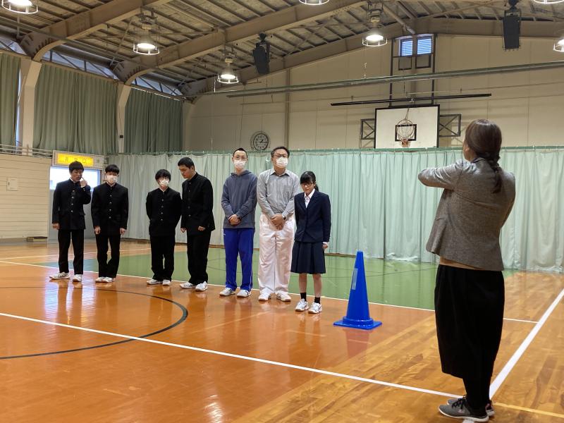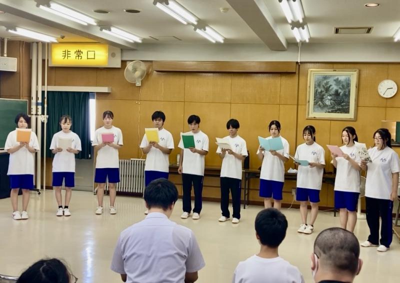 呼吸法や発声法では母音の口形を学び、マ行で口を閉じる動きが必要なこと、ハ行は息を大きく出す必要があることを学びました。参加した生徒全員は普段意識することのなかった口形の違いに驚き、楽しみながら各行の声を出しました。