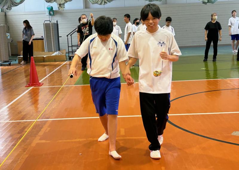 2試合目は交流試合として浜松視覚特別支援学校と対戦しました。チーム力は5分と5分。1セット目は浜松、2セット目は合同チームが取りセットカウント1対1となりました。3セット目は残り時間18秒間のみのセットとなり惜しくも1点差で敗戦しました。とても白熱した試合となりました。